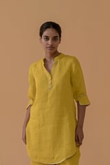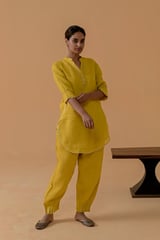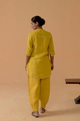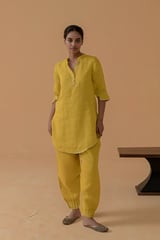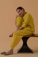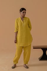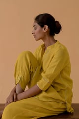 Mustard Gauze Linen Straight Kurta Set with Gota Trim