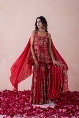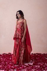 Red Floral Tunic and Sharara Co-ord Set with Dupatta