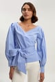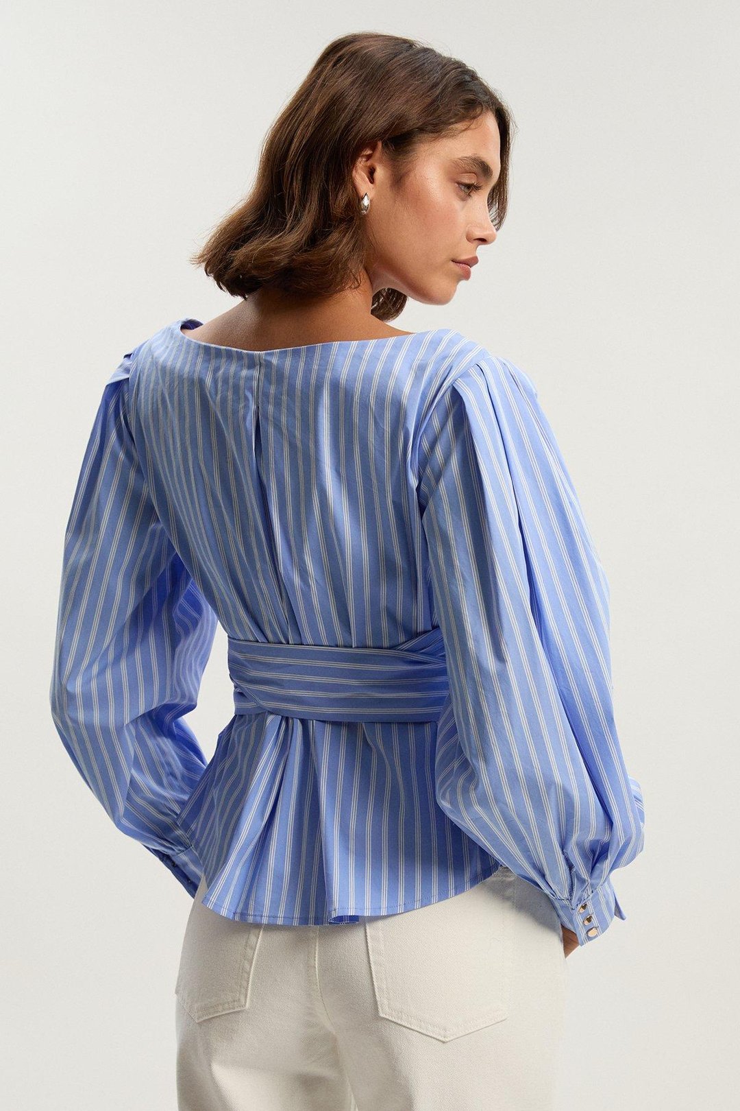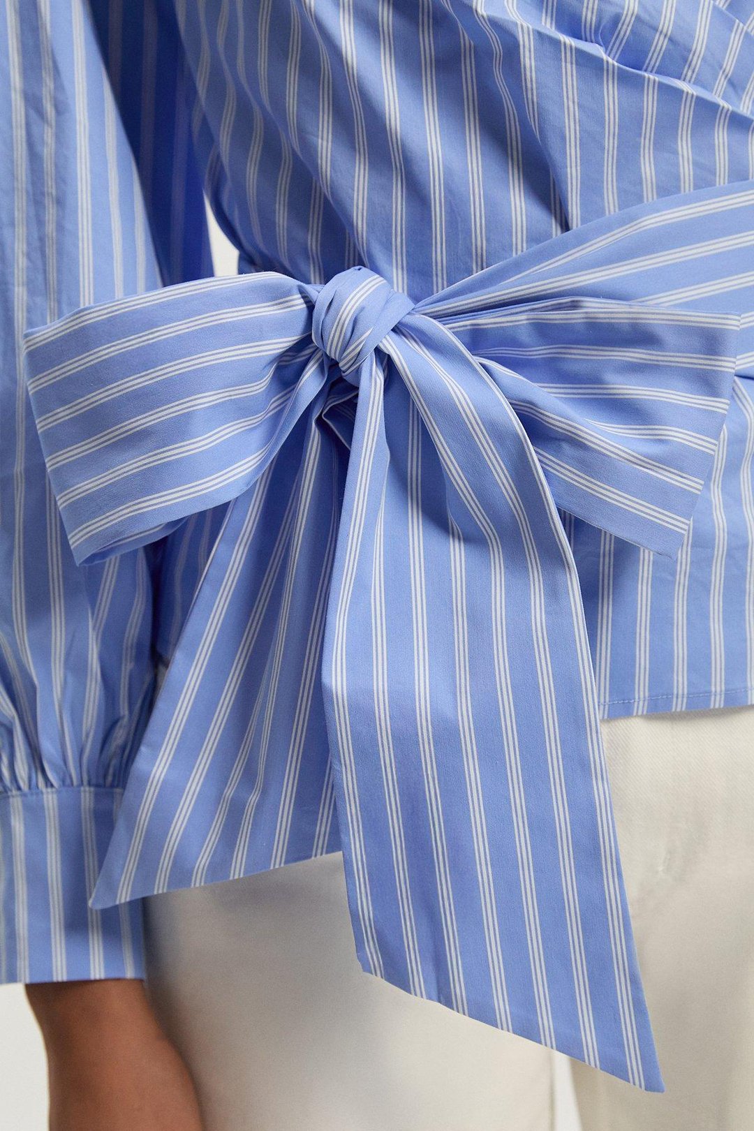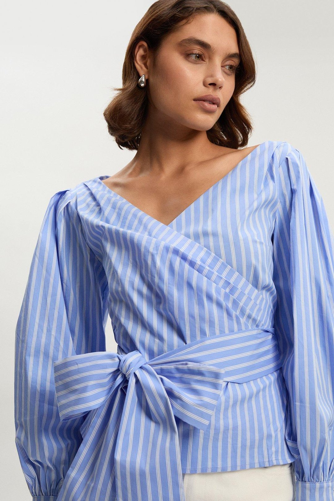 Stripe Cotton Poplin Cold Shoulder Woven Wrap Detail Blouse
