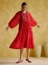 Red Lehriya Printed Flared Kurta with Embellished Yoke