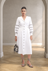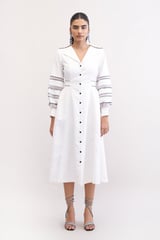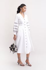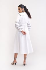 White Cotton Denim Fit and Flare Midi Dress with Balloon Sleeves
