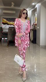 Hot Pink Printed Kurta and Pant Co-ord Set with Crystals