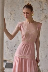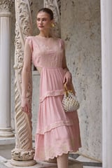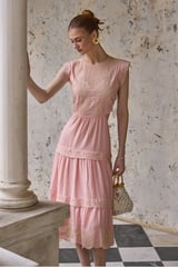Pastel Pink Linen Tiered Midi Dress with Tonal Embroidery