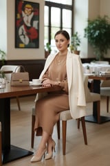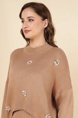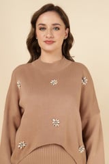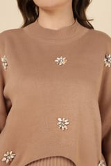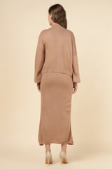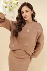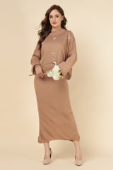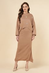 Brown Rib-Knit Maxi Dress Set with Floral Embellishments