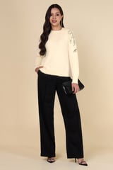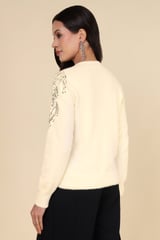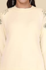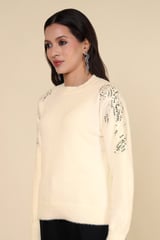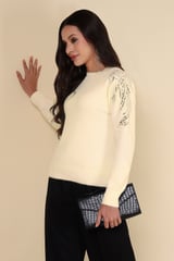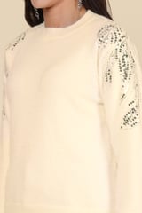 Ivory Sequin Sleeve Round Neck Pullover Sweater