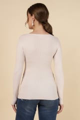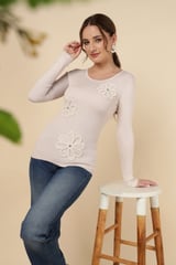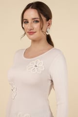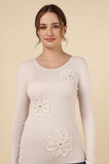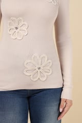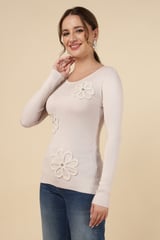 Beige Rib-Knit Pullover Sweater with Floral Appliqué