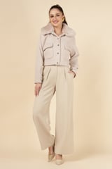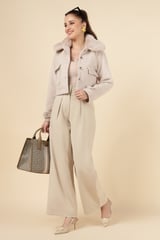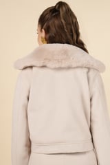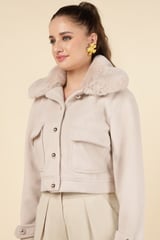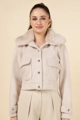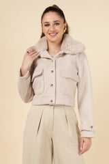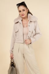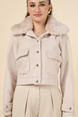 Beige Cropped Button-Front Jacket with Faux-Fur Collar