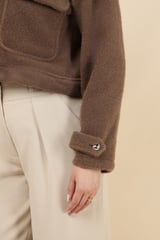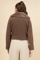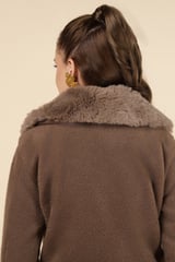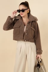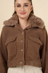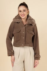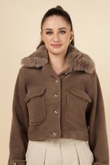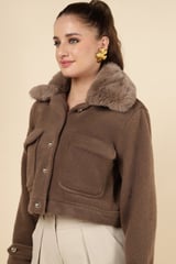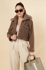 Taba Brown Cropped Jacket with Faux-Fur Collar