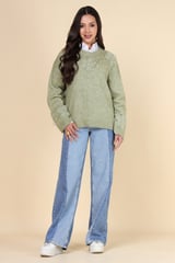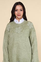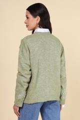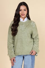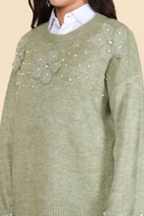 Green Floral Appliqué Embellished Pullover Sweater