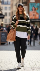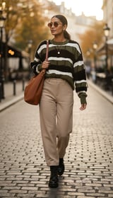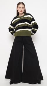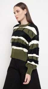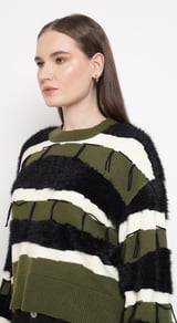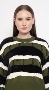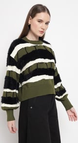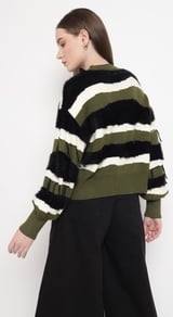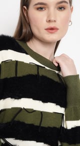 Olive Striped Faux-Fur Detail Pullover Sweater