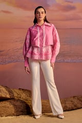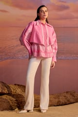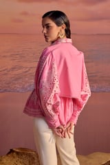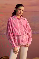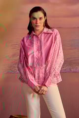 Pink Cotton Cutwork Button-Down Blouse with Lace Trim