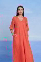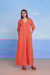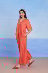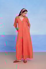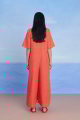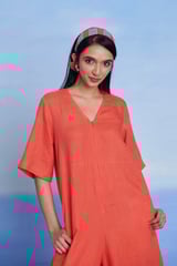 Tangerine Linen Half Sleeves Flared Jumpsuit