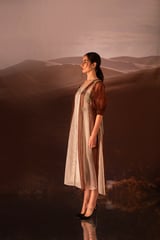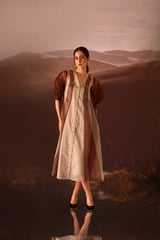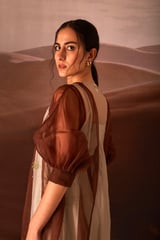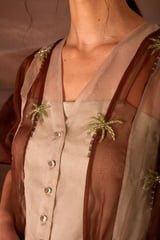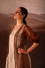 Brown and Beige Colorblock Midi Dress with Palm Embroidery