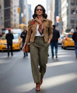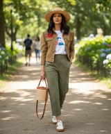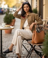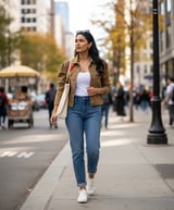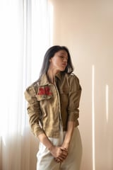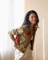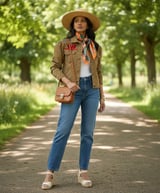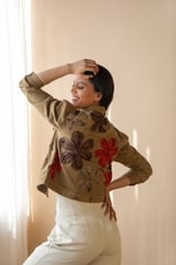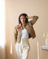 Camel Beige Cropped Denim Jacket with Floral Embellishment