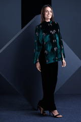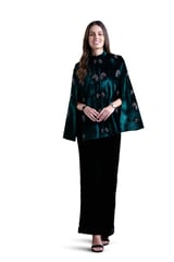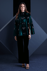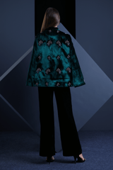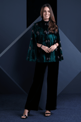 Green Velvet Hand-Embellished Cape with Mandarin Collar