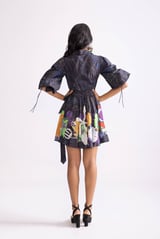 Black/Multi Wrap Collared Mini Dress with Placement Print