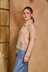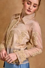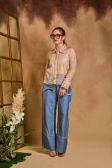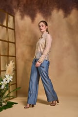 Cream Organza Appliqué Shirt and Blue Pants Co-ord Set