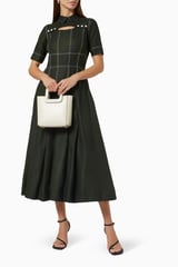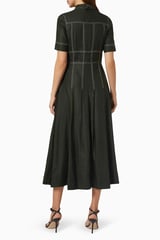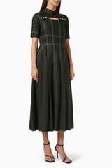 Green Collared Fit and Flare Midi Dress with Yoke Cut-Out
