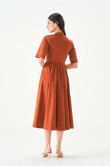 Rust Cotton Fit and Flare Midi Dress with Mandarin Collar