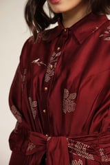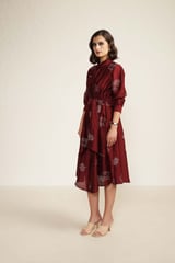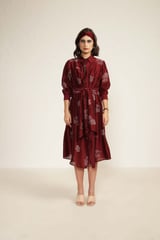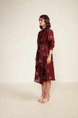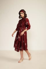 Burgundy Printed Tie Up Dress with Embroidery