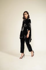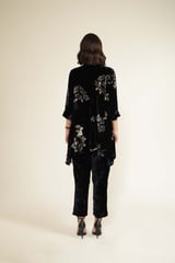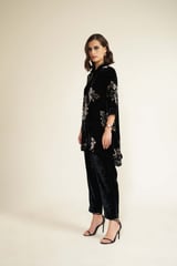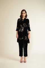 Indigo Shirt in Silk Velvet with Discharge Print and Straight Pants in Silk Velvet