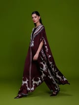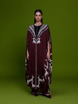 Burgundy Cupro Satin Printed Kaftan and Pants Co-ord Set