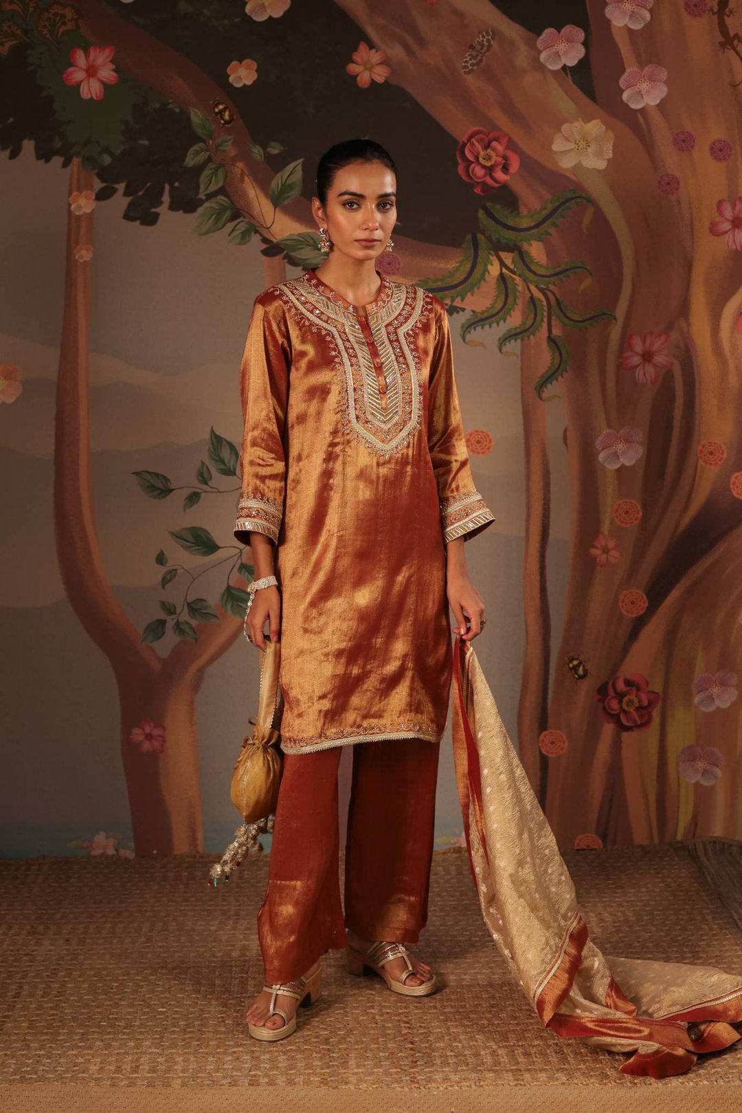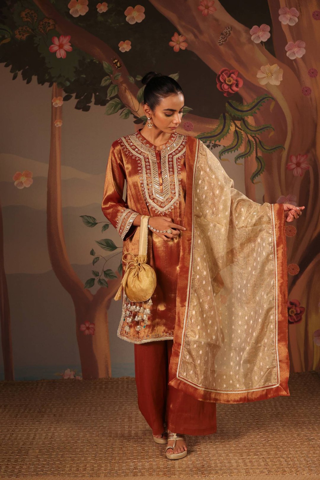 Zari Tissue Kurta with Flared Pants & Dupatta