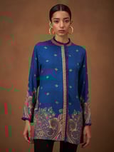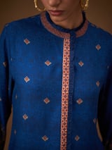 Blue Printed Longline Top with Mandarin Collar