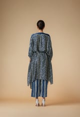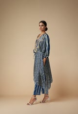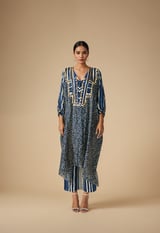 Blue Modal Satin Belted Kaftan with Embellished V-Neck