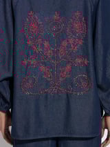 Dark Denim Relaxed Collared Shirt Top with Back Embroidery