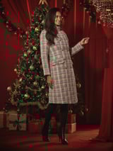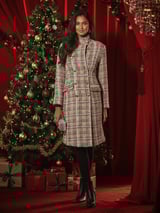 Beige Brown Plaid Tweed Double-Breasted Knee-Length Coat