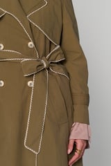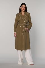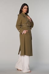 Khaki Long Trench Coat with Lace Trim and Belt