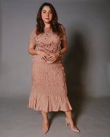 Nude 3D Floral Peplum Top and Midi Skirt Co-ord Set