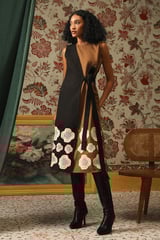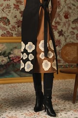 Black and Tan Colorblock Wool Wrap Coat with Embroidery