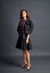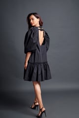 Black Mini Smock Dress with Open Back and Pink Embroidery