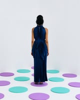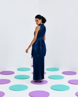 Blue Pleated Halter High-Neck Top with Waist Tie