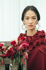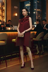 Maroon A-Line Mini Dress with 3D Floral Neck Detail
