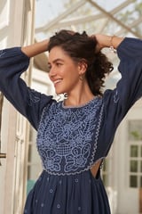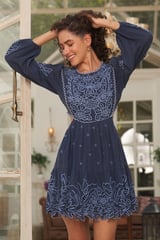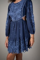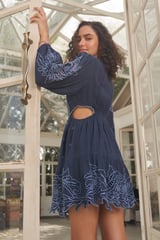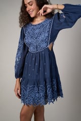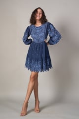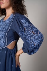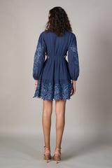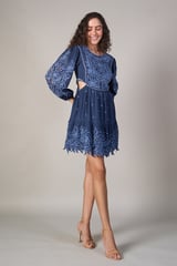 Blue Embroidered Cutwork Fit and Flare Mini Dress