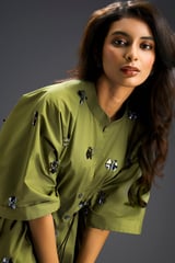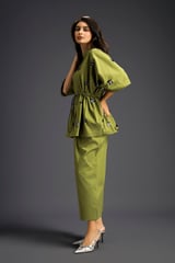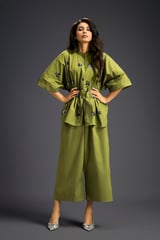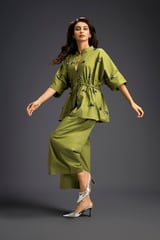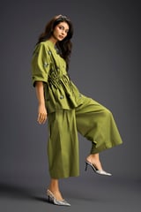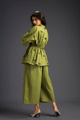Green Cotton Embellished Co-ord Set with Wide-Leg Pants